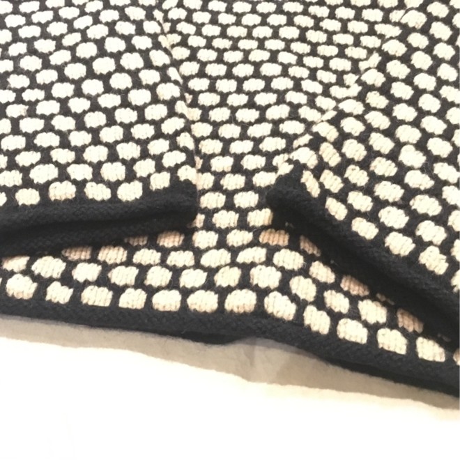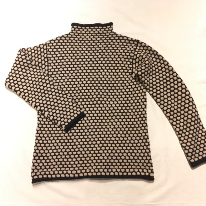 ラグランの無地はまだ見ますが、こちらはセットインの編み込み。