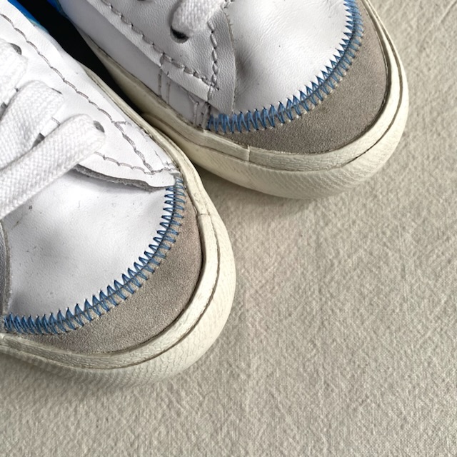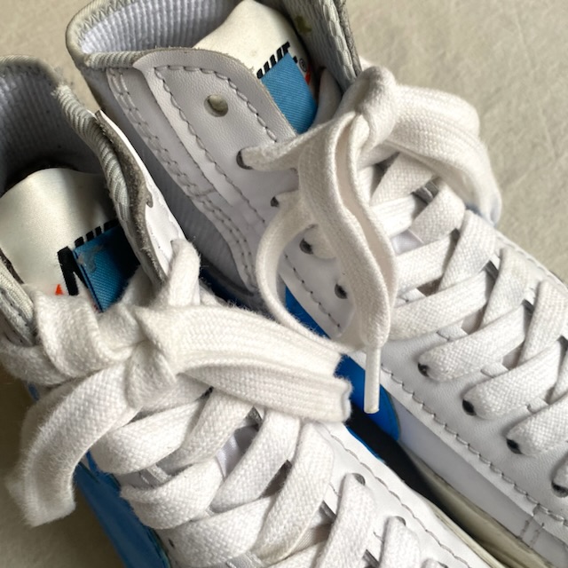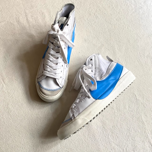 トゥ先の切り替えや履き口ニット仕様、きしめん太レースにビッグなスウォッシュ。