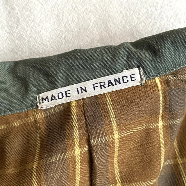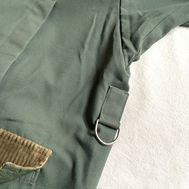 グリーンの生地感や比翼ボタンはどことなくフレンチな装い。