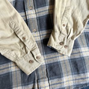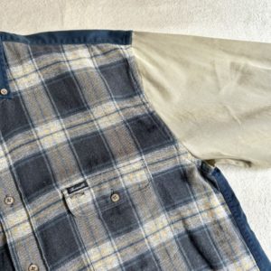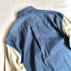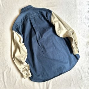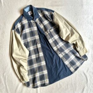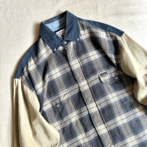 こちら大胆な切り替えが目を惹くBDシャツ。1枚で着てもしっかりインパクトありますね。チェックの配色も◎