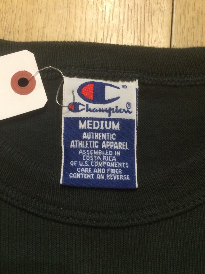 色がうまく出ませんでしたが深緑です、チャンピオン特有のガッシリした生地感なのでガシガシ着ましょう。