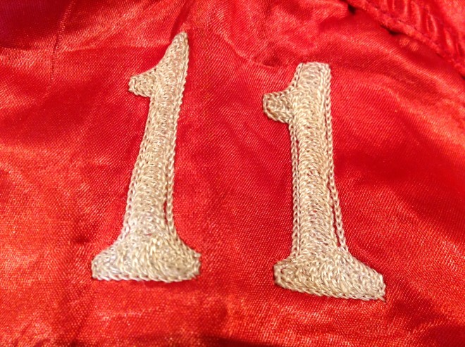 左袖にチェーンステッチで番号のみ。チーム名や学校名が入ってないので詳細分かりません。