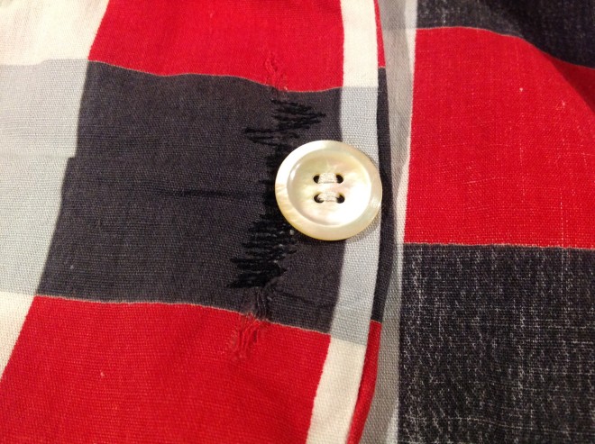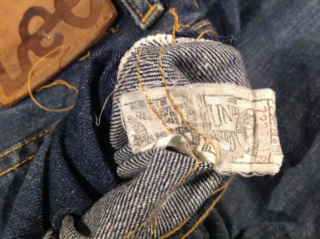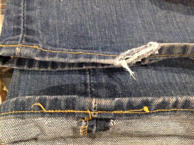 レザーパッチのステッチのほつれと左裾の擦れがあります。