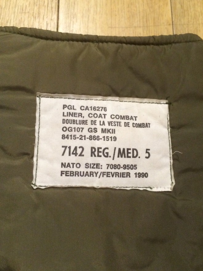カナダ軍、コンバットコート、のライナーです。