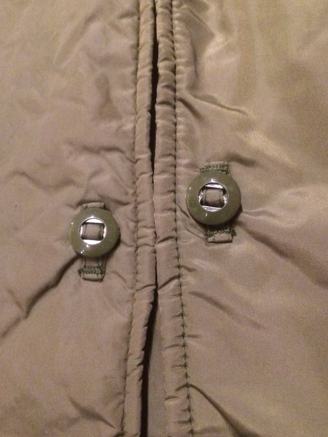 キルティングステッチのないソリッドなナイロンが洗練された印象、ボタンを上手く使えば前も閉じられそうです。