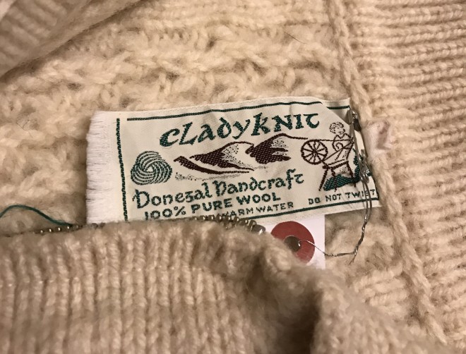 ハンドメイドのカーディガン、淡い紫とアイボリーの2色使い。