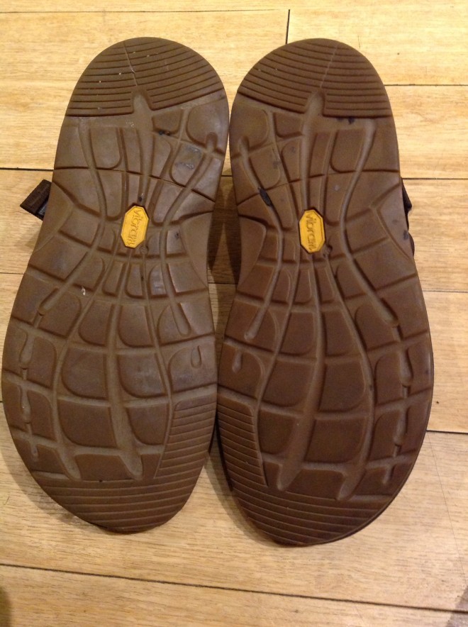 ストラップ付き、ビブラムソール、フットベッドも厚みがあって気持ち良さそうです。