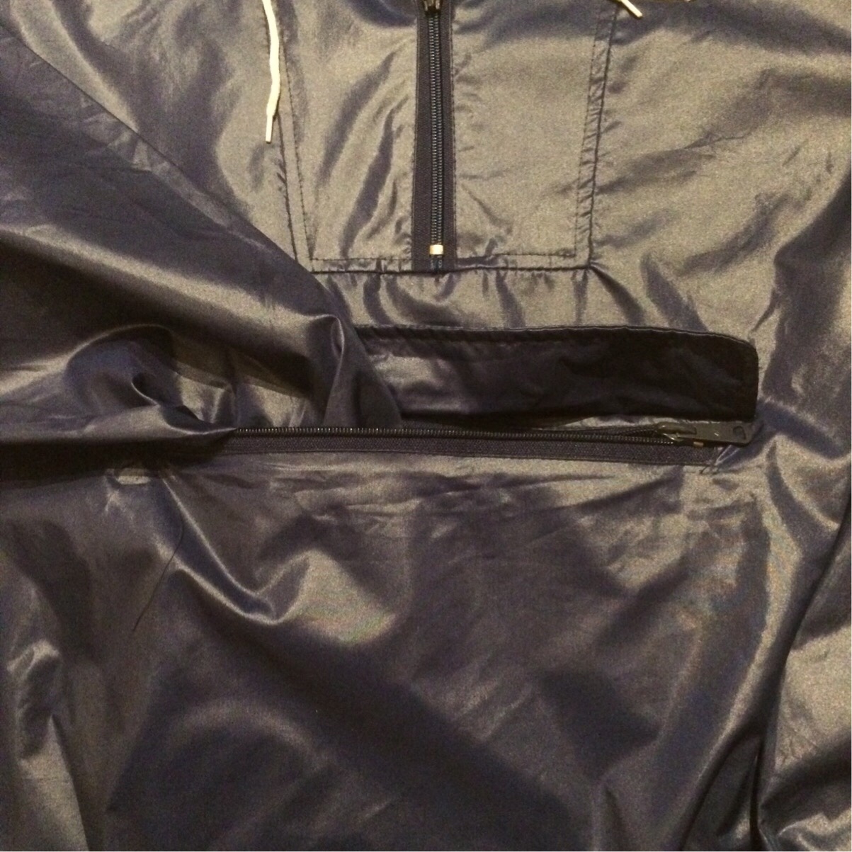 首元、腰回りに、 ホワイトのドローコード付き。 これがまた良い役割を果たしており、 濃いめのネイビーの中で差し色になってくれています。