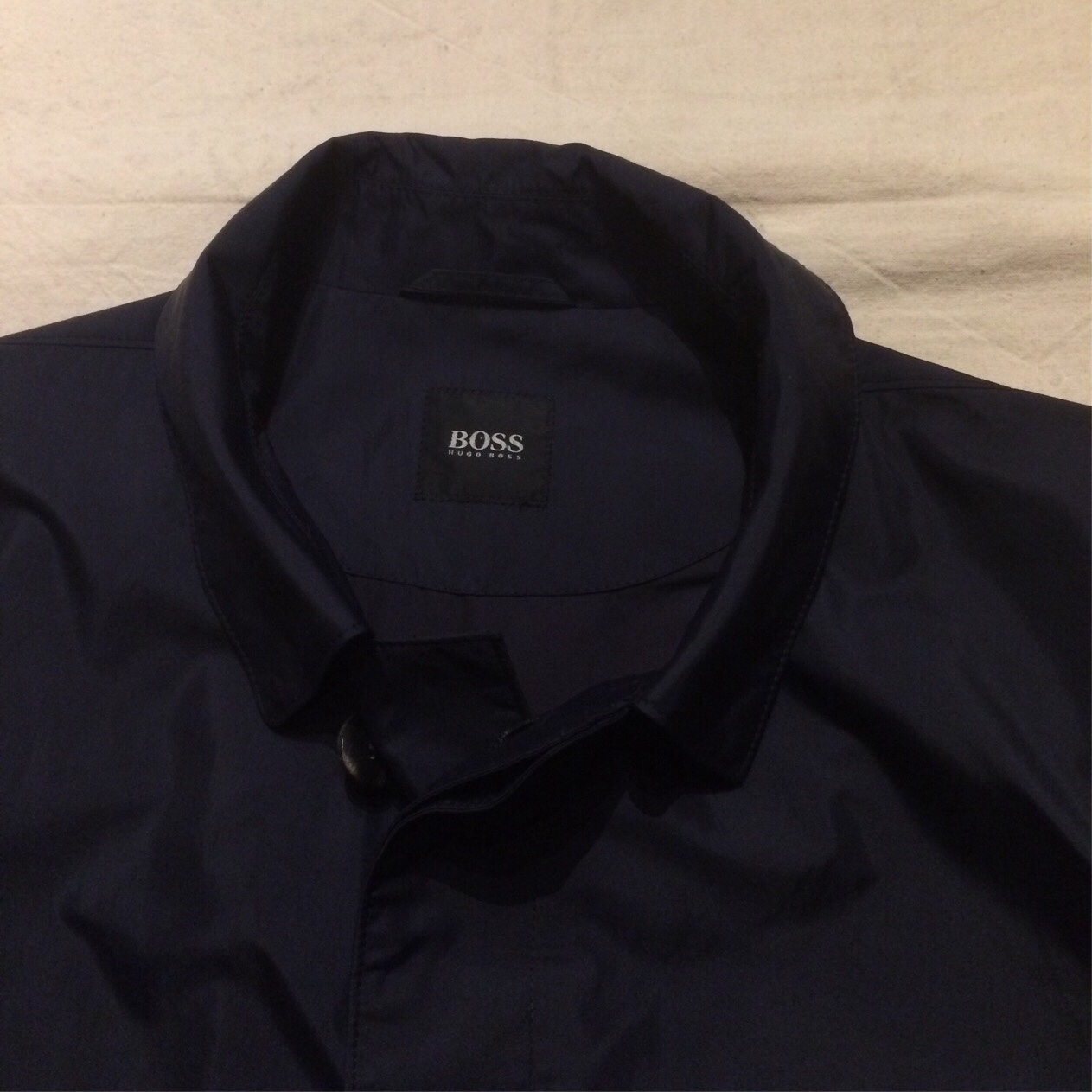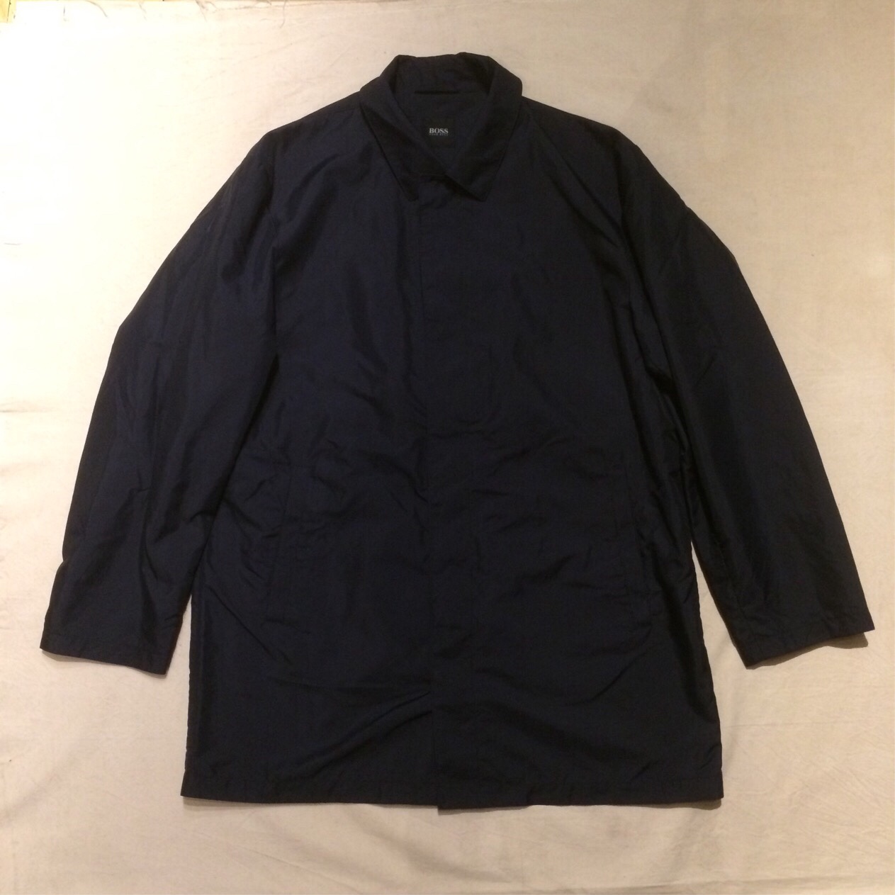 ボスのシンプルなステンカラーコート。