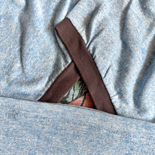 首元、袖口がネイビーで全体が締まって一枚で完結する優秀なやつですね。