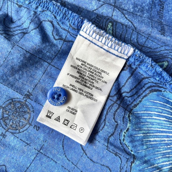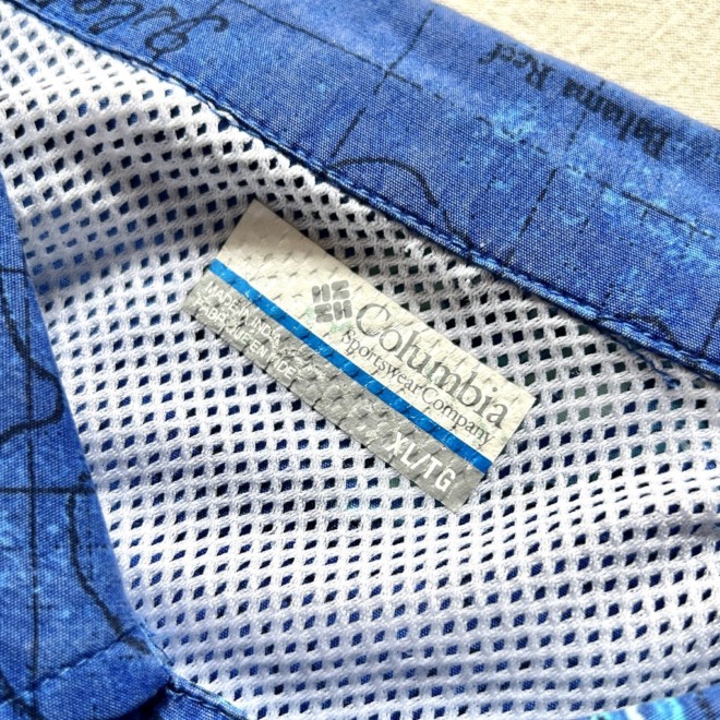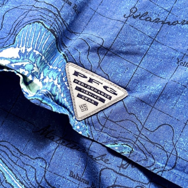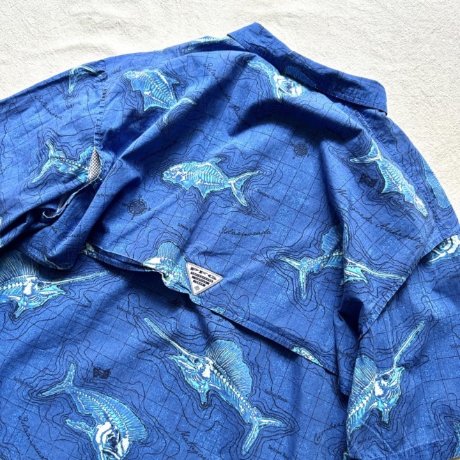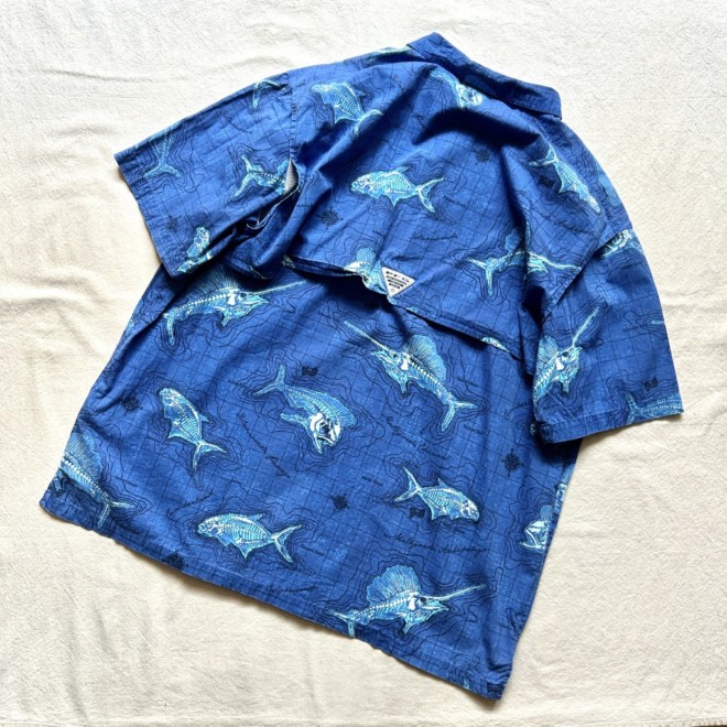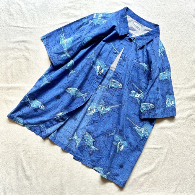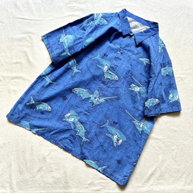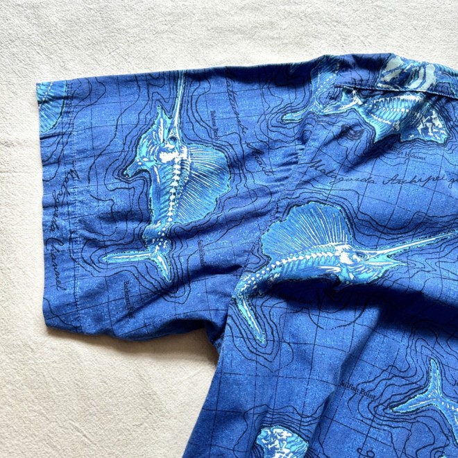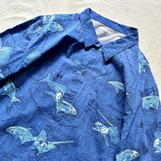 フィッシングシャツは無地物が多い印象なので柄物は比較的珍しいかと。しかも魚に地図に海。情報量多めなところも面白いですね。