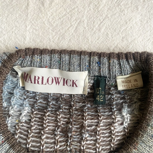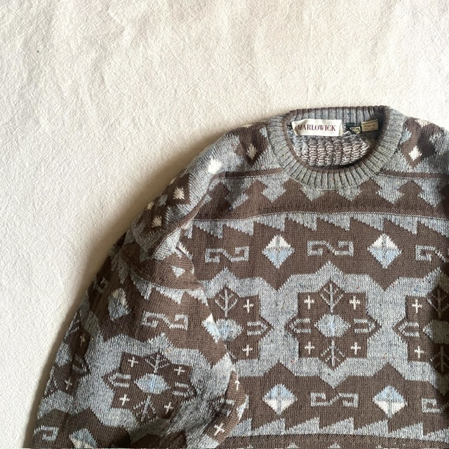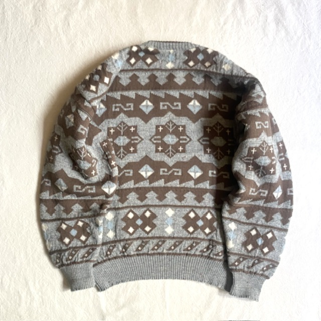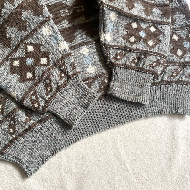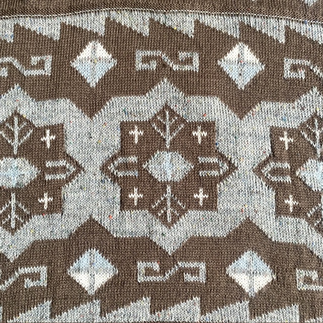 ミックスカラーの毛糸で編まれたベースカラーに、ブラウンで幾何学模様。