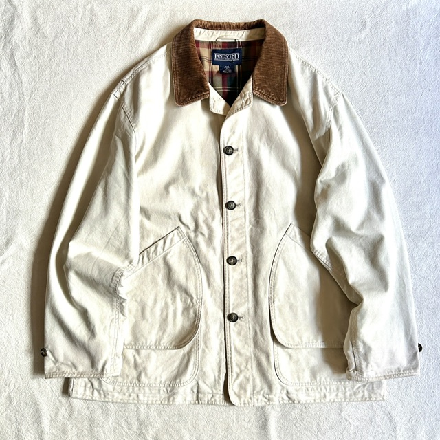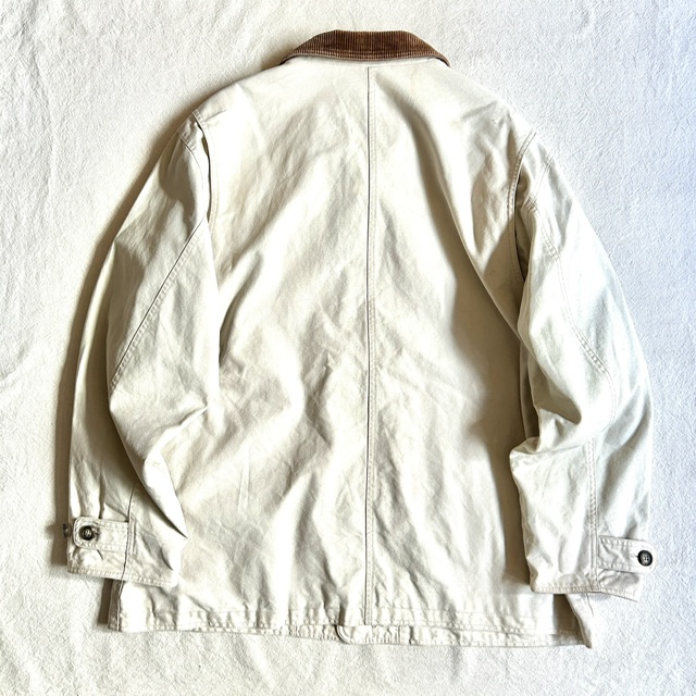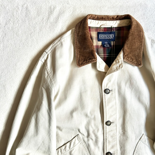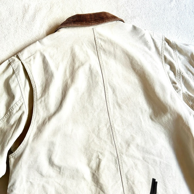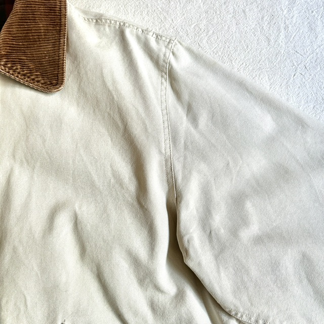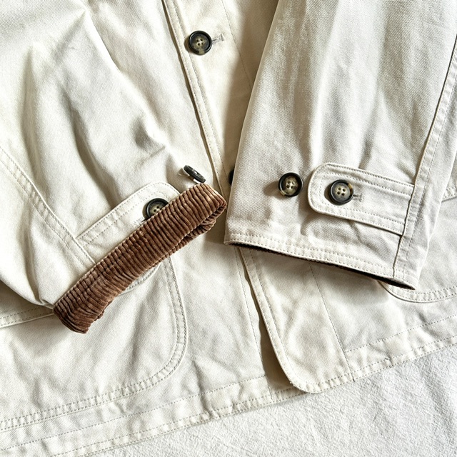 温かみのあるクリーミーなボディーに、襟はブラウンのコーデュロイ。