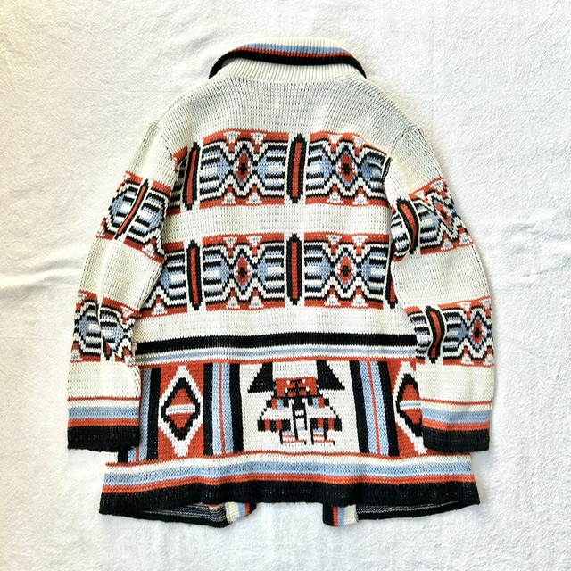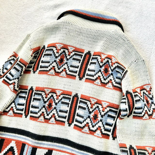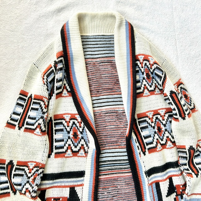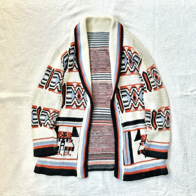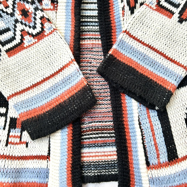 アイボリーカラーをベースにブラック、オレンジ、サックスブルーで織柄はいった雰囲気抜群カーデ。