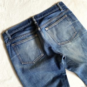 今のトレンドとは異なるスッキリ細身のデニムパンツ。